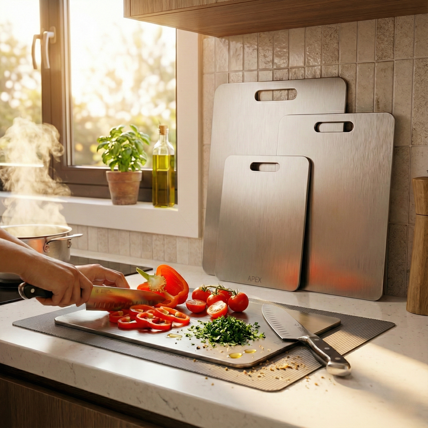 Wir präsentieren die Titan-Schneidebrett Kollektion. Die Kombination aus reinem Titan und einer porenfreien Oberfläche garantiert maximale Hygiene und eine mühelose Reinigung